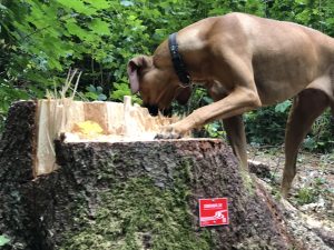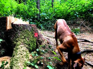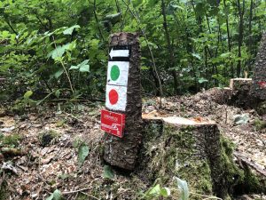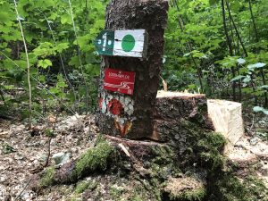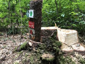 Am „Durchbruch“ nach dem Ringwall auf der Houbirg, dort wo man Richtung Reckenberg geht, wurden einige Bäume gefällt und wir finden es wirklich eine sehr nette Geste, dass die Forstarbeiter unsere Wegezeichen haben stehen lassen. DANKE für die Unterstützung; soetwas finden wir eine sehr noble Geste. (Stand 2018)